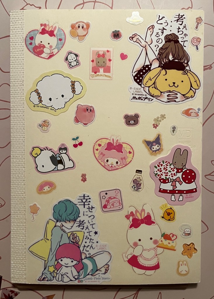 Below is a photo of my notebook! I’m a big fan of decorating everything in my bag, inside and out, so I put as many stickers on it as I could (shout out to B-side Label).