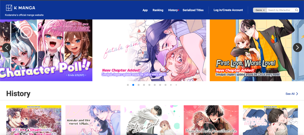 K Manga is Kodansha’s official English website / app, and offers a wide variety of manga to read. While most first chapters of the manga offered on the site are free to read, after that you can choose to pay with coins or money. There are many different ways to accumulate coins, so you can read without having to spend any money! If you want to binge something though, I do recommend being ready to spend a little cash.