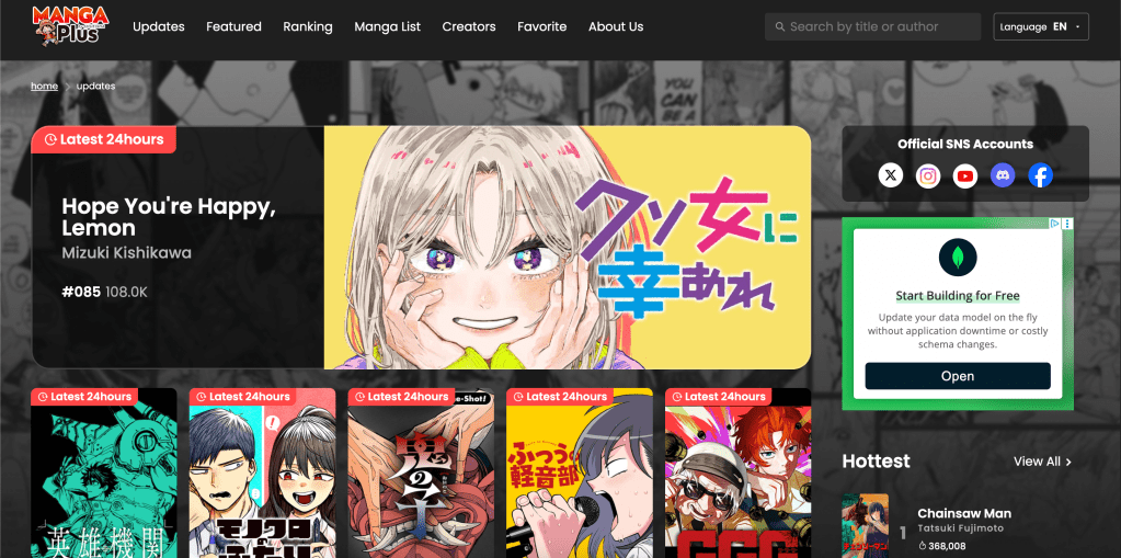 Manga Plus is both a website and app brought to us by Shueisha, a Japanese manga publishing company. This is one instance where I would highly recommend downloading the app. Why: while you can read the 3 earliest and 3 latest chapters of any given series on the website for free, everything is completely free to read on the app.