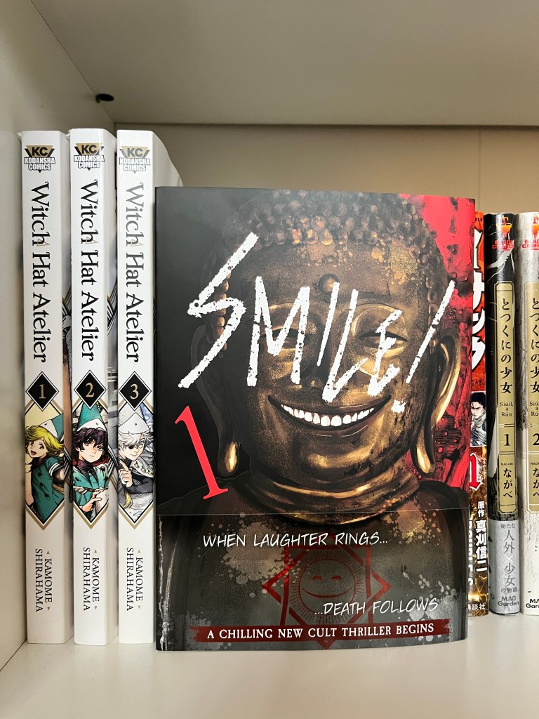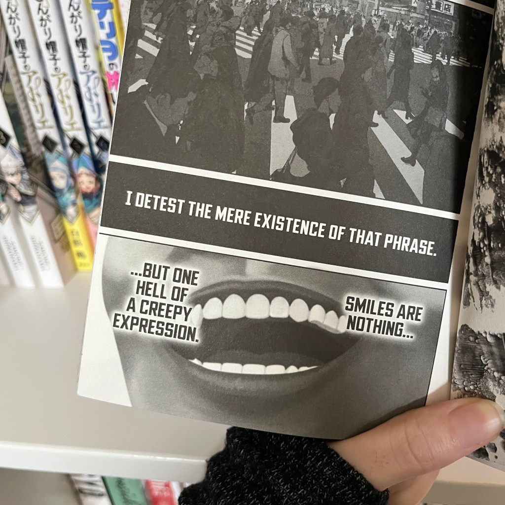 Smile! Introduces us to the “Smiling Hearts Society”, where all will be alright so long as you keep smiling. True to the name, there is only one cult member ever depicted without a smile on their face. Perhaps because we’re seeing the world through our pessimistic protagonist’s eyes, but many of the smiles plastered across the occultists faces appear to tetor on almost demonic-looking. Some of them smile so forcefully that their eyes appear to be closed, and others just laugh instead of speak. By the end of the volume, the thought of a smile felt a little tainted.